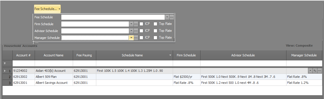 Arcons has created Composite Billing® as the ideal solution. Now the user has ultimate flexibility in creating and assigning fee schedules to accounts. In one household, each account can have a different fee schedule. The user is not limited to choose either composite or traditional schedules, they can have both in the same household. In this sample, notice that three accounts have three different schedules: the first is a traditional tiered schedule and the other two each have a different Composite Billing® schedules. It is simple to assign the Composite Billing® schedules right in the household, with the click of a button. Just highlight the account(s) then from the fee schedules drop down button choose the appropriate schedule on the fly. No need to first create the required combination of components into one schedule!